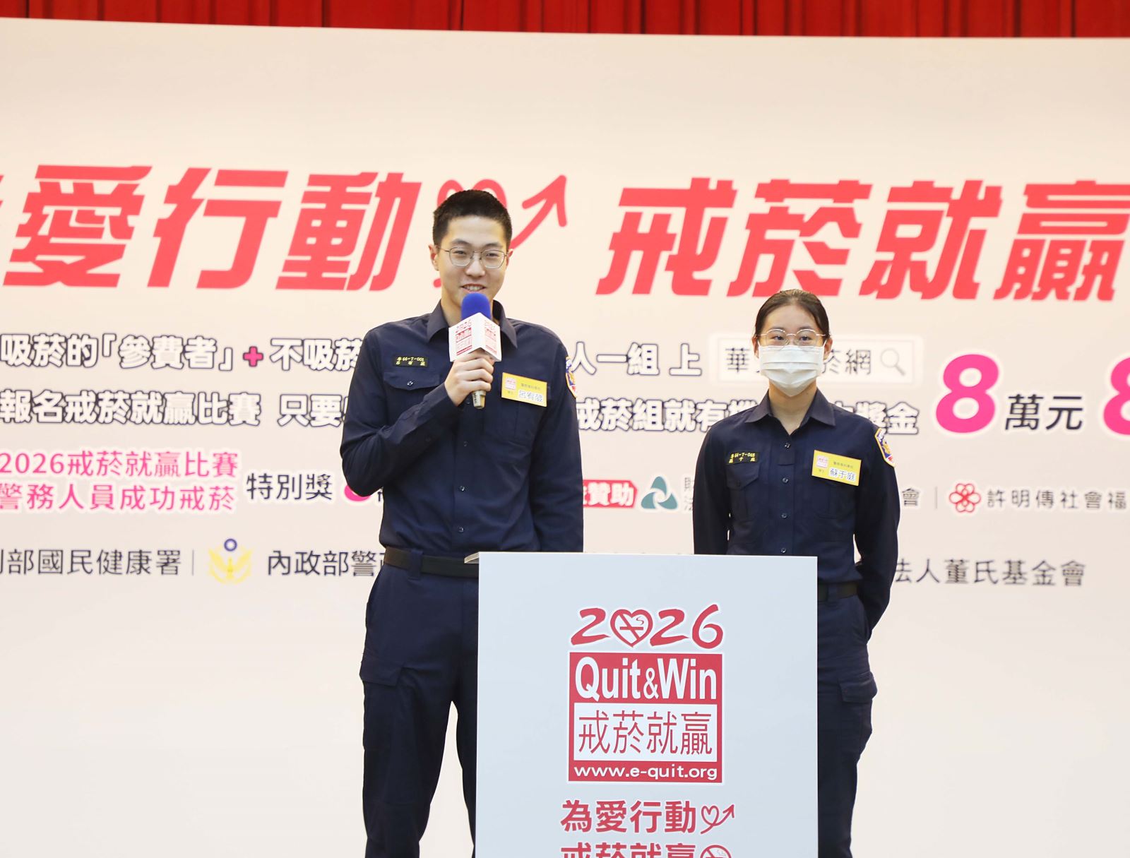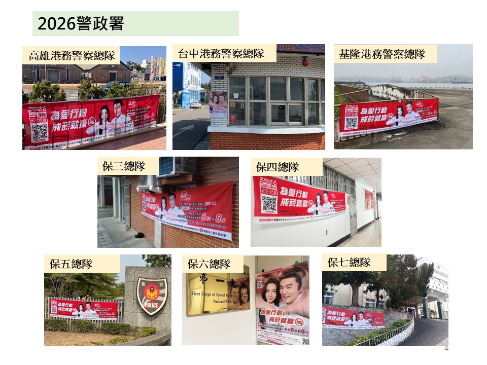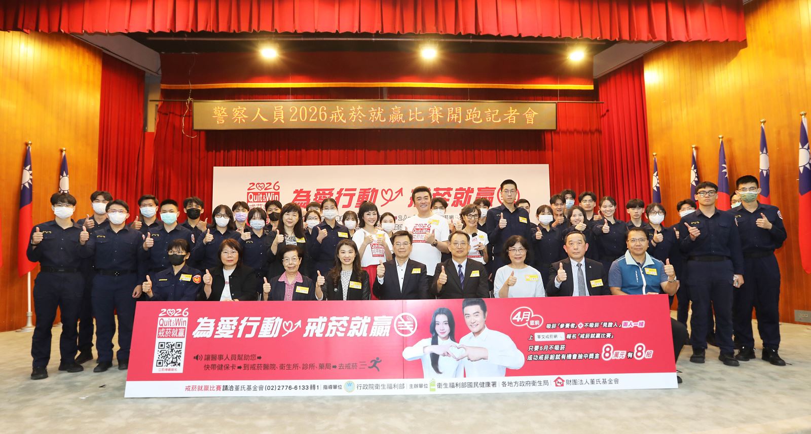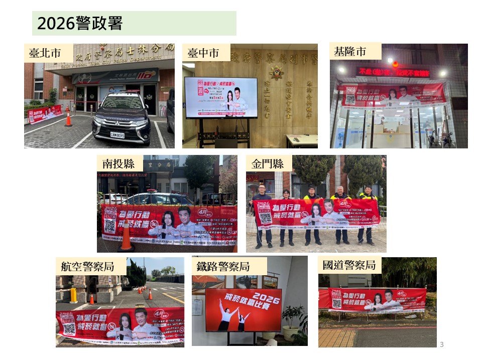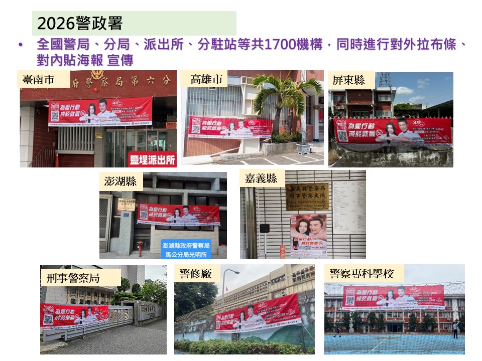 為促進7.5萬名警務人員(含警校生)及其家庭更健康圓滿,「2026戒菸就贏比賽」警政署再加碼「警務人員成功戒菸專屬獎」(8萬元2組),即警察同仁,除可抽全台成功戒菸獎項外,還可以抽警察同仁專屬的獎項。同時,全台1700個警局、分局、派出所、分駐站一起懸掛布條、張貼海報、運用跑馬燈等宣導,合力推動助人戒菸、宣導戒菸就贏。